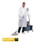La bata cuenta con un cierre frontal con velcro, lo que facilita ponerla y quitarla rápidamente. Además, los puños y la cintura elásticos aseguran un ajuste perfecto, evitando que se deslice o se mueva mientras se trabaja. Su color blanco no solo le da una apariencia limpia y profesional, sino que también es fácil de identificar en entornos que requieren altos estándares de higiene.
