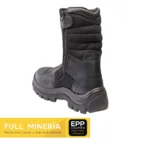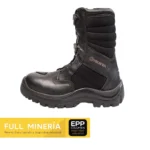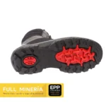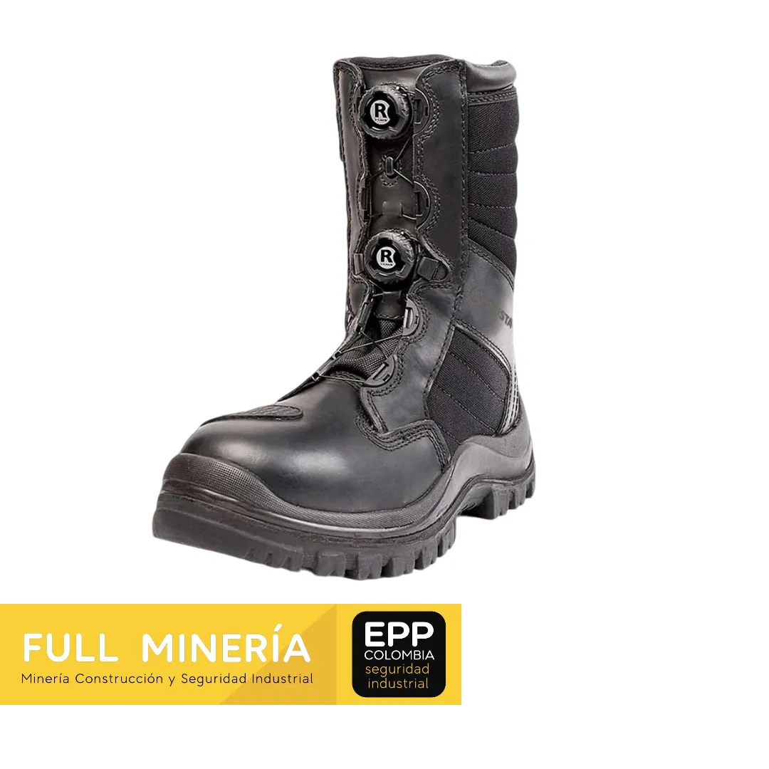 Esta bota está diseñada con un sistema de tacos auto-limpiantes que evita la acumulación de barro y suciedad, permitiendo una mayor tracción y adherencia en diversos terrenos. Además, cumple con la norma ASTM 2413, incluyendo una suela dieléctrica que brinda protección en entornos donde se requiere seguridad eléctrica. El sistema de doble anclaje exterior, el cierre tipo zipper y el elástico posterior facilitan el ajuste y la colocación rápida del calzado, mientras que el sistema I-lock asegura su fijación, brindando soporte adicional.