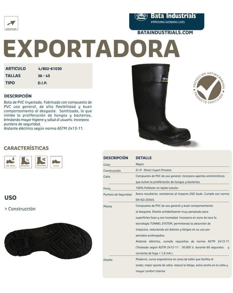 Las Botas Exportadoras en PVC son la elección ideal para quienes buscan un calzado de seguridad que combine comodidad, durabilidad y protección. Fabricadas con un compuesto de PVC altamente flexible, estas botas ofrecen una resistencia excepcional a hidrocarburos y sus derivados, lo que las convierte en una opción perfecta para entornos industriales y laborales exigentes.