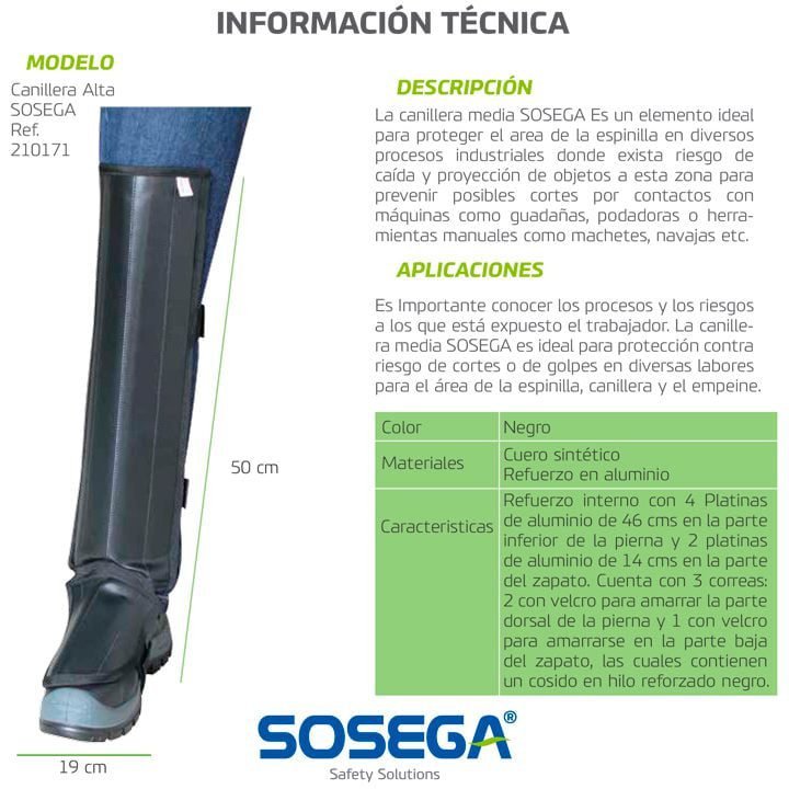 La Canillera Alta SOSEGA es un dispositivo de protección diseñado para cubrir el área de la espinilla durante trabajos industriales en los cuales existe riesgo de caídas o proyección de objetos, previniendo posibles cortes y lesiones causadas por máquinas como guadañas, podadoras o herramientas manuales como machetes y navajas.