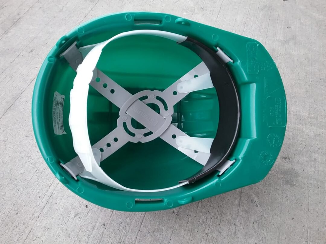 El cabezal incorpora una banda anti-sudor absorbente para mayor frescura y comodidad, ideal en largas jornadas de trabajo. Además, el diseño incluye cuatro puntos de sujeción para barbuquejo, incrementando la estabilidad y el uso seguro en ambientes de mucho movimiento o trabajo en altura.