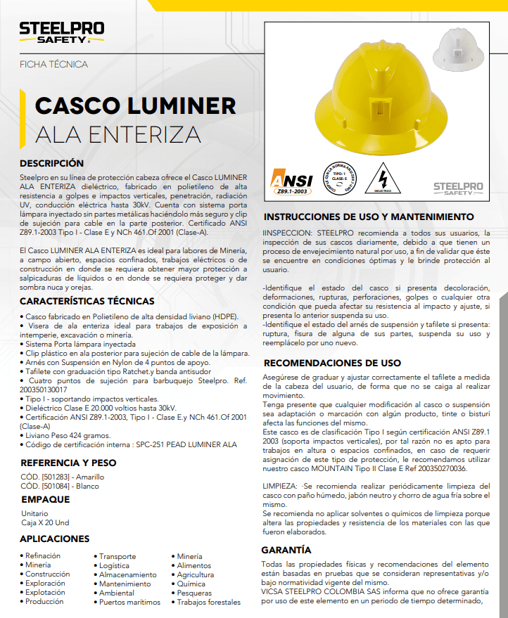 El casco Luminer ala enteriza (tipo Safari) ha sido desarrollado para entornos de trabajo industrial y minero donde la exposición a riesgos eléctricos, radiación solar, lluvias y salpicaduras es constante. Su diseño cuenta con una visera de ala completa que proporciona protección adicional cubriendo orejas y nuca, lo que lo hace ideal para uso en exteriores y actividades a la intemperie como minería, excavación y construcción[1][7][8].