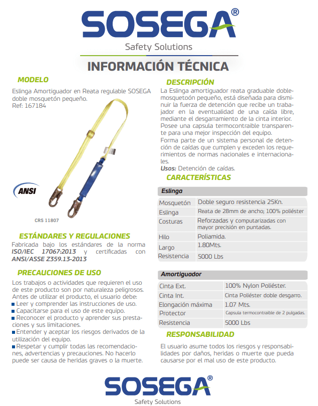 La Eslinga Amortiguador Regulable SOSEGA está diseñada para reducir la fuerza que recibe un trabajador en caso de caída libre, aumentando su seguridad y confort.