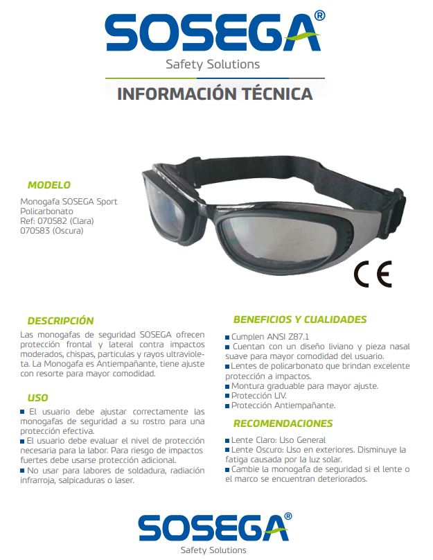 Es fundamental que el usuario ajuste correctamente las monogafas para asegurar su efectividad. Además, debe evaluar el nivel de protección necesario para su trabajo, y para riesgos de impactos fuertes se recomienda utilizar protección adicional.