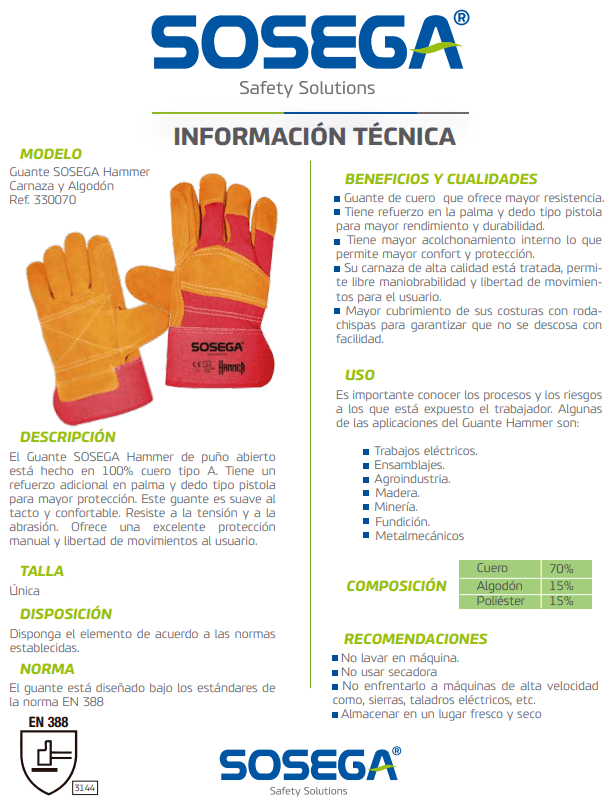 El Guante Hammer Soldadura SOSEGA de puño abierto está fabricado en 100% cuero tipo A, ofreciendo un equilibrio ideal entre resistencia, confort y libertad de movimientos para el usuario.