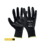 La palma cuenta con un recubrimiento en lámina de nitrilo negra, que brinda resistencia a la abrasión y al desgaste, incrementando la durabilidad del guante y asegurando un agarre firme en condiciones secas o ligeramente grasosas.