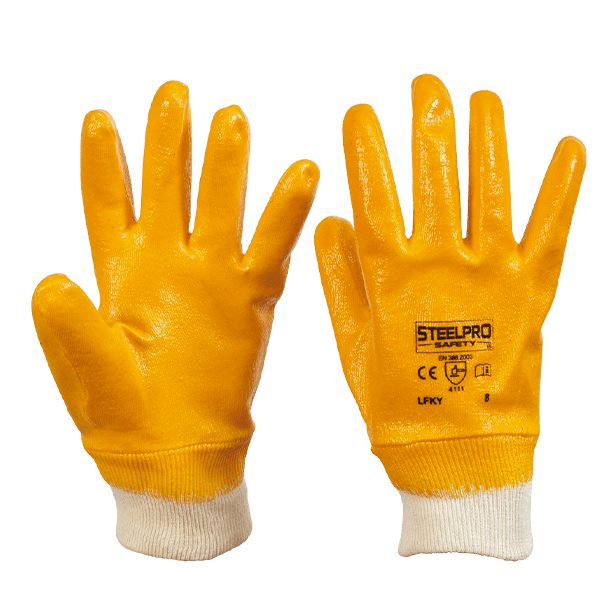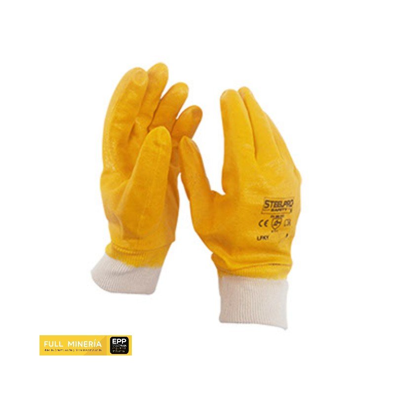 - Recubrimiento de nitrilo amarillo resistente a químicos y riesgos mecánicos.