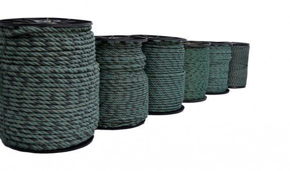 Soga retorcida en rafia fibrilada de polipropileno recuperado post-industria, de alta resistencia y suavidad. Fabricada en color verde pinta negra.